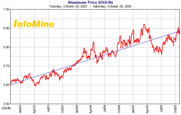 Bauxite from these mines is then sent to a refinery, where it is turned into alumina. While Australia dominates the production of alumina, Guinea currently produces less than 1% of the world's alumina needs, despite having enormous reserves of bauxite. At today's levels, the amount of bauxite in Guinea will last over 1000 years. Guinea is to aluminum the way Athabasca is to oil. Please see: Bauxite Reserves By Country. There have been no new refineries built in the world in the past 20 years. Once alumina is made, it is shipped to a smelter to turn it into aluminum. There are currently around 180 smelters in the world. This process is extremely energy intensive and most smelters have their own power plants that do nothing but supply energy for the production of aluminum. This makes the price of aluminum extremely dependant on the cost of energy. With the high cost of oil and natural gas, many smelters are being squeezed by those whose energy is provided in a different form. Hydroelectric plants currently supply the power for over 50% of these smelters. When considering whether or not to invest in Aluminum, there are three main factors to consider. One, is the supply for transportation products such as automobiles and planes. Aluminum, because of its low weight and high strength is the material of choice for most of these goods. Automobiles, especially, are a cyclical industry, doing well when times are good, and hurting when times are bad. This makes the demand for aluminum a commodity that is dependant on the business cycle. The Commodity Investor believes 2006 will be a slow year economically, reducing the demand for goods such as automobiles, and hence reducing demand for aluminum. The second factor to consider is Guinea's impact on the market. While Guinea's bauxite reserves are greater than 10 times the amount of bauxite in all of China, they mine virtually the same amount of bauxite each year. If these reserves can be exploited, Guinea's may become one of the great economic powers in all of Africa. Much of this, and hence the supply of bauxite, will depend on the political situation in that country. Global Alumina Inc. is attempting to make reality of this situation by building a new refinery right next to a mine in Guinea. Already it has worked out agreements with the government to finish this project by 2010. With lots of cheap labor available, Global Alumina's refinery may one day become one of the most profitable in the industry. This is, however, not going to impact the market for another several years. The third factor is alternative supplies of aluminum, specifically the ability to recycle used packaging materials and car parts. 70% of the aluminum ever produced is still in existence, and recycling of these products is far less expensive than producing new material. If the price of aluminum continues to go up, The Commodity Investor expects a return to recycling incentives. With so much old aluminum remaining, recycling has the ability to cap the price of aluminum in the long run. While aluminum will participate in the commodities boom over the next 10-15 years, the outlook for the next 2 years is towards the downside. Look for a bottom sometime in 2007, and then a small investment in aluminum can be warranted. Aluminum is a strong, conservative investment for the long term commodities investor.